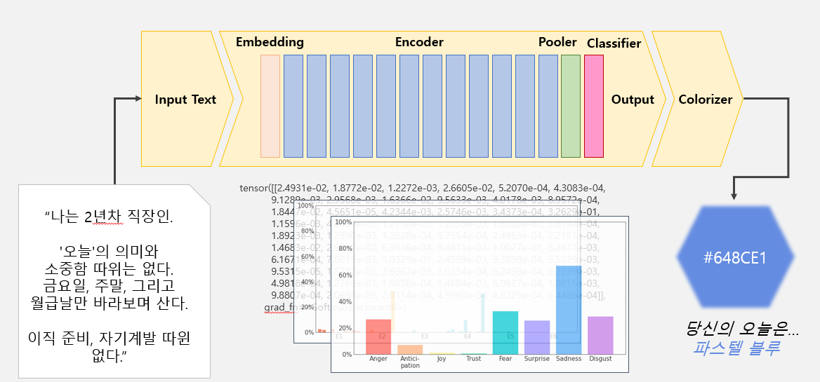 - 토큰화된 데이터는 Embedding 1개 레이어, Encoder 12개 레이어, Pooler와 Classifier 레이어 1개씩을 거쳐 최종적으로 8가지 기본 감정 수치를 계산