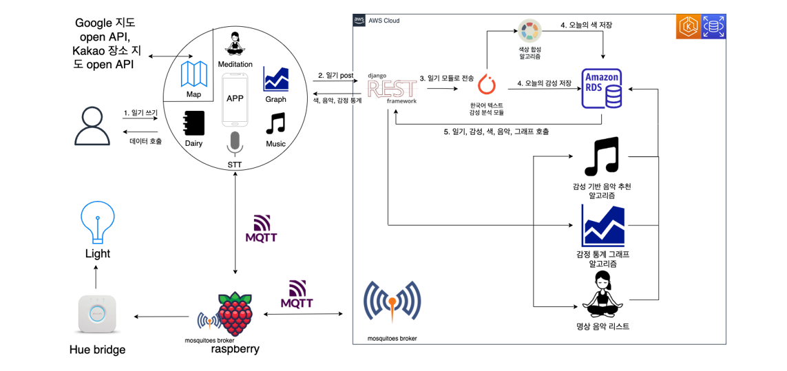 - 사용자의 일기는 REST API 통해 AWS서버에 내의 AI감정분석 모델, 색상 합성 알고리즘을 거쳐 아마존RDS 데이터베이스에 저장이 된다.