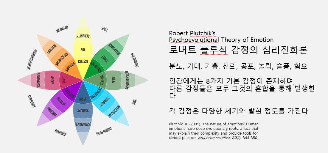 Plutchik, R, 2001, The nature of emotions: Human emotions have deep evolutionary roots, a fact that may explain their complexity and provide tools for clinical practice. American scientist, 89(4), 344-350.
