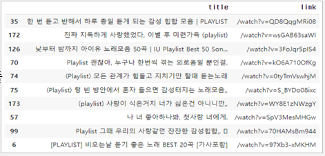 KoBERT모델에서 추출된 노래영상별 감정을 이용하여 사용자의 감정과 가장 유사한 노래영상을 추천해준다.