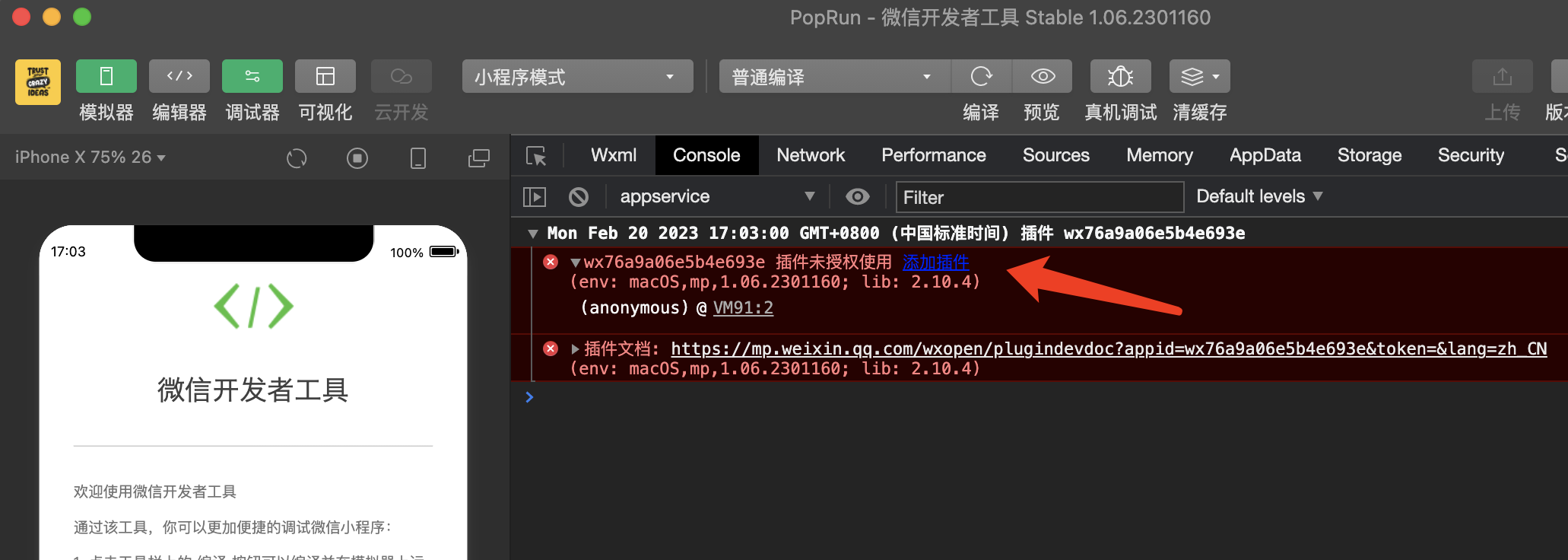 VM23:3 插件文档: https://mp.weixin.qq.com/wxopen/plugindevdoc?appid=wx76a9a06e5b4e693e&token=&lang=zh_CN(env: macOS,mp,1.06.2301160; lib: 2.10.4)A: 点击报错中的蓝色文字添加插件,就可以便捷添加。