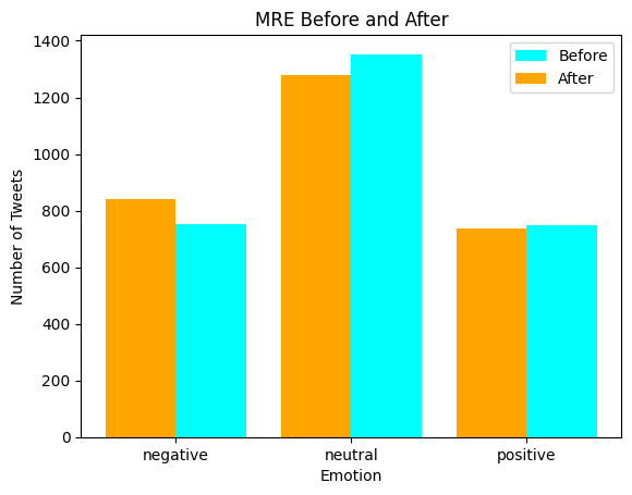 After the data analysis process we also compared the MRE analysis of the period before and after to determine whether there have been changes in users opinions, for example here below we can observe the MRE bar chart that represents the most relevant emotions per user regarding the Louvre event followed by a pie chart that displays how many have actually changed their overall opinion after the incident occurred.