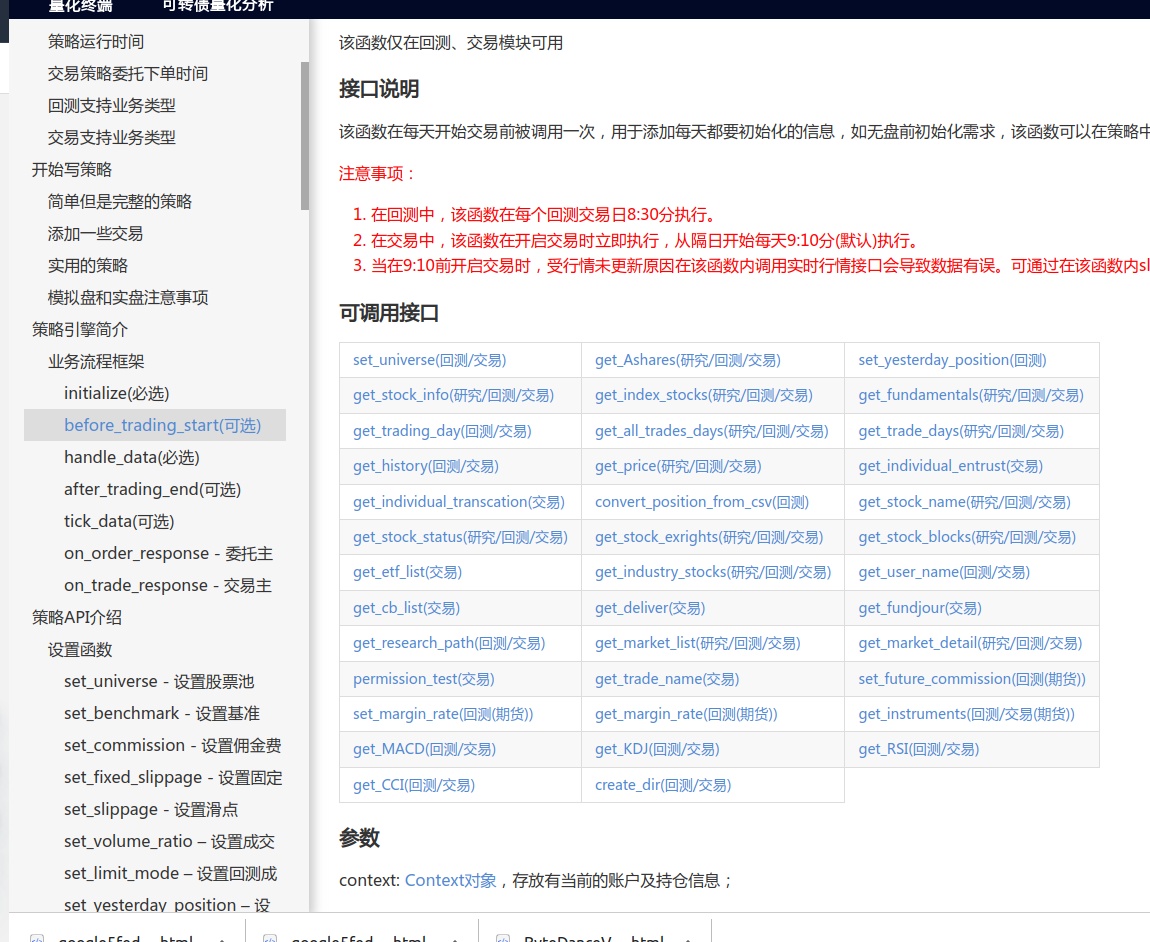 def initialize(context): g.security = '600570.SS' set_universe(g.security) def handle_data(context, data): security = g.security sid = g.security # 取得过去五天的历史价格 df = get_history(5, '1d', 'close', security, fq=None, include=False) # 取得过去五天的平均价格 average_price = round(df['close'][-5:].mean(), 3) # 取得上一时间点价格 current_price = data[sid]['close'] # 取得当前的现金 cash = context.portfolio.cash # 如果上一时间点价格高出五天平均价1%, 则全仓买入 if current_price > 1.01*average_price: # 用所有 cash 买入股票 order_value(g.security, cash) log.info('buy %s' % g.security) # 如果上一时间点价格低于五天平均价, 则空仓卖出 elif current_price < average_price and get_position(security).amount > 0: # 卖出所有股票,使这只股票的最终持有量为0 order_target(g.security, 0) log.info('sell %s' % g.security)