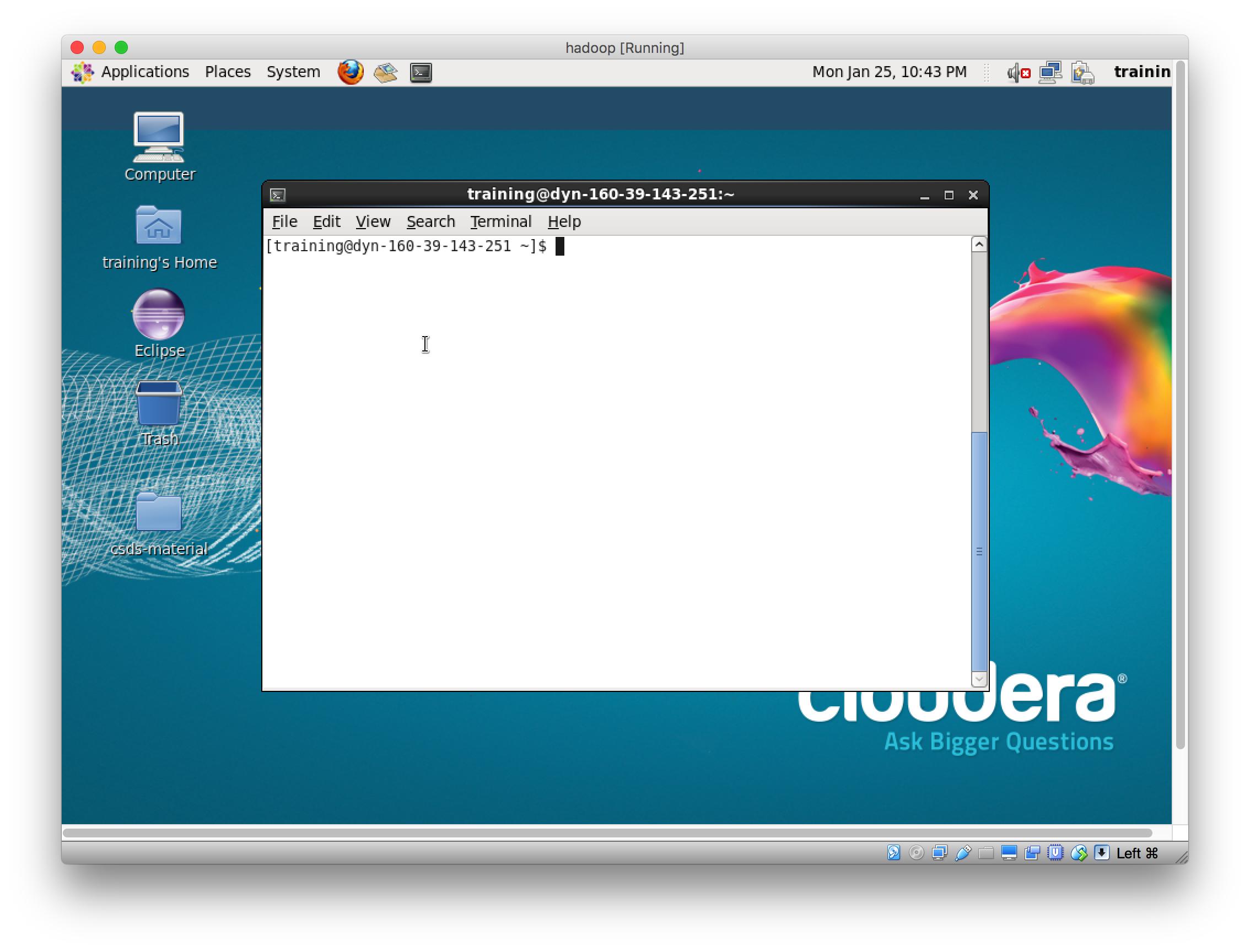 Before we start running MapReduce jobs, we first need to get the code. When the VM first starts, the terminal should already be open. Get started by cloning this repository.