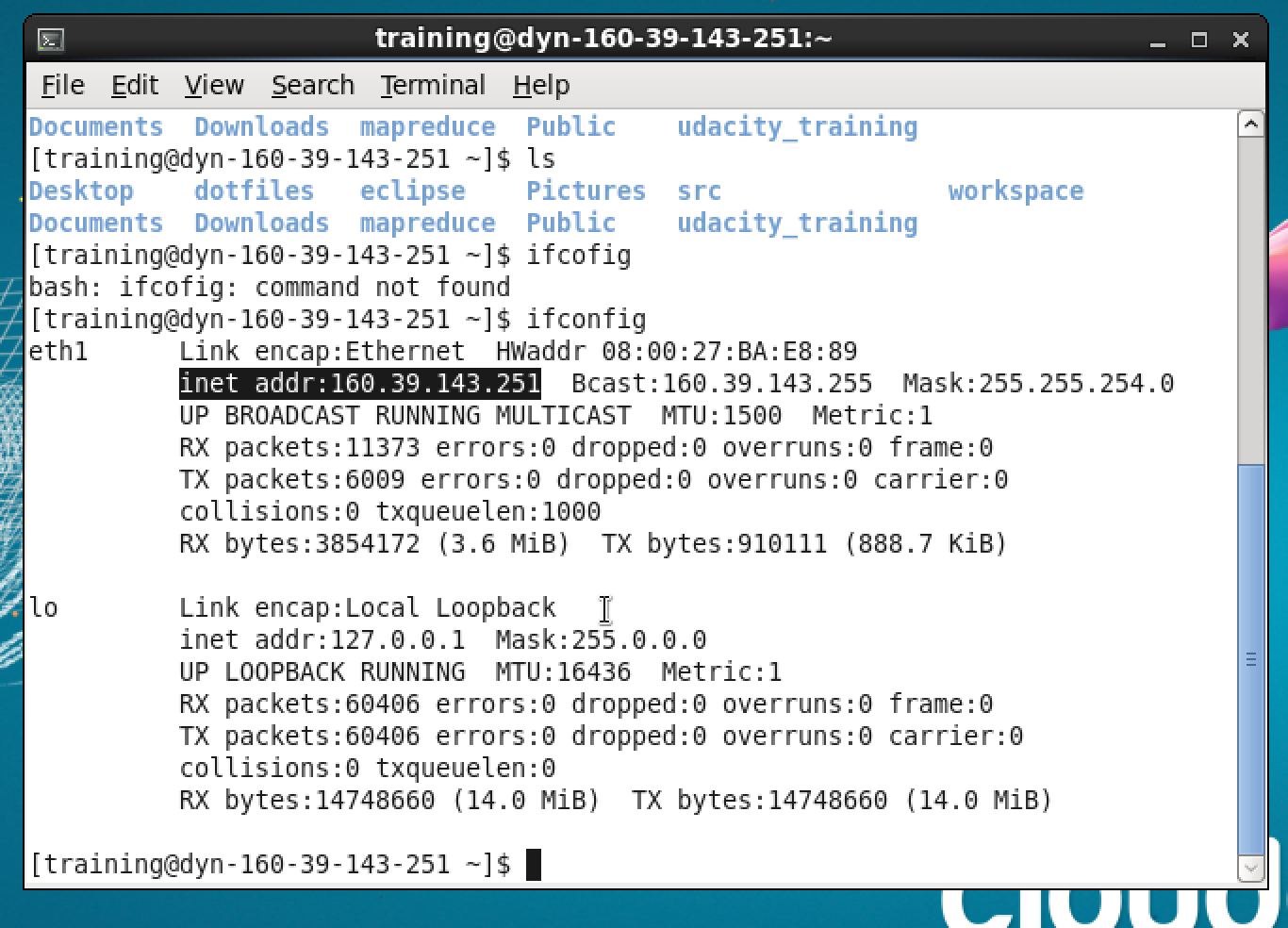Linux and Mac users can also SSH into the machine by running ssh training@ip-address and entering the password - training. To get the IP address of the machine, just run ifconfig and taking note of the inet addr.