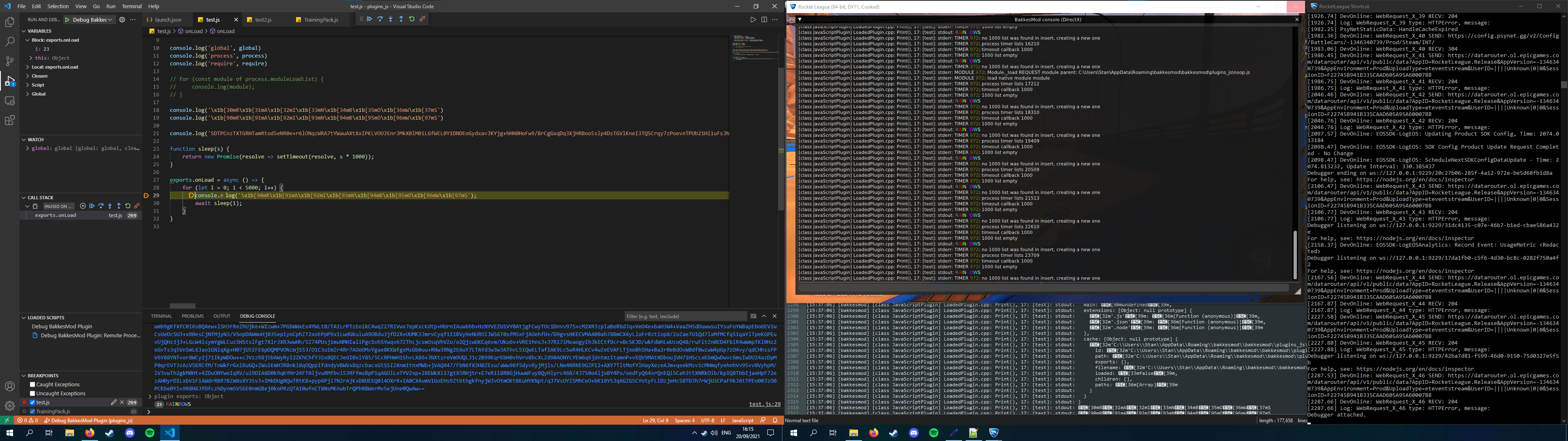 This plugin adds JavaScript bindings to the bakkesmod sdk through node.js and v8pp.