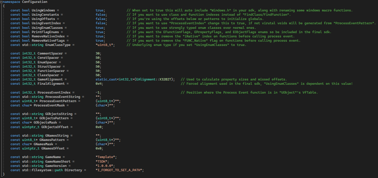 Any further configuration MUST BE DONE IN THE Configuration.cpp ONLY! This file contains everything from class alignment, process event settings, global patterns and offsets, your games name and version, and most importantly the directory used for SDK generation.