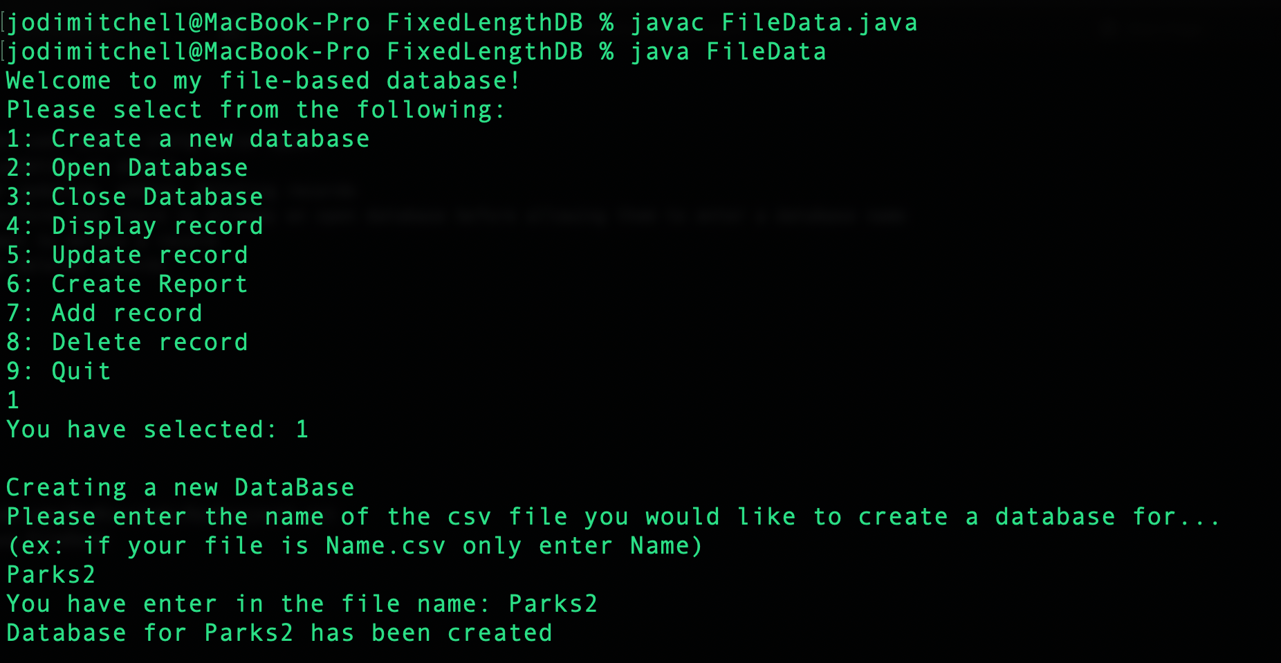 Takes in the .data file that was made from the create database option and allows the file to be read and written to. If a database is already open it will prompt the user to close it. For creating a report, updating, adding, and deleting a record all require a database to be open. If a database is not open it will prompt the user to open one.