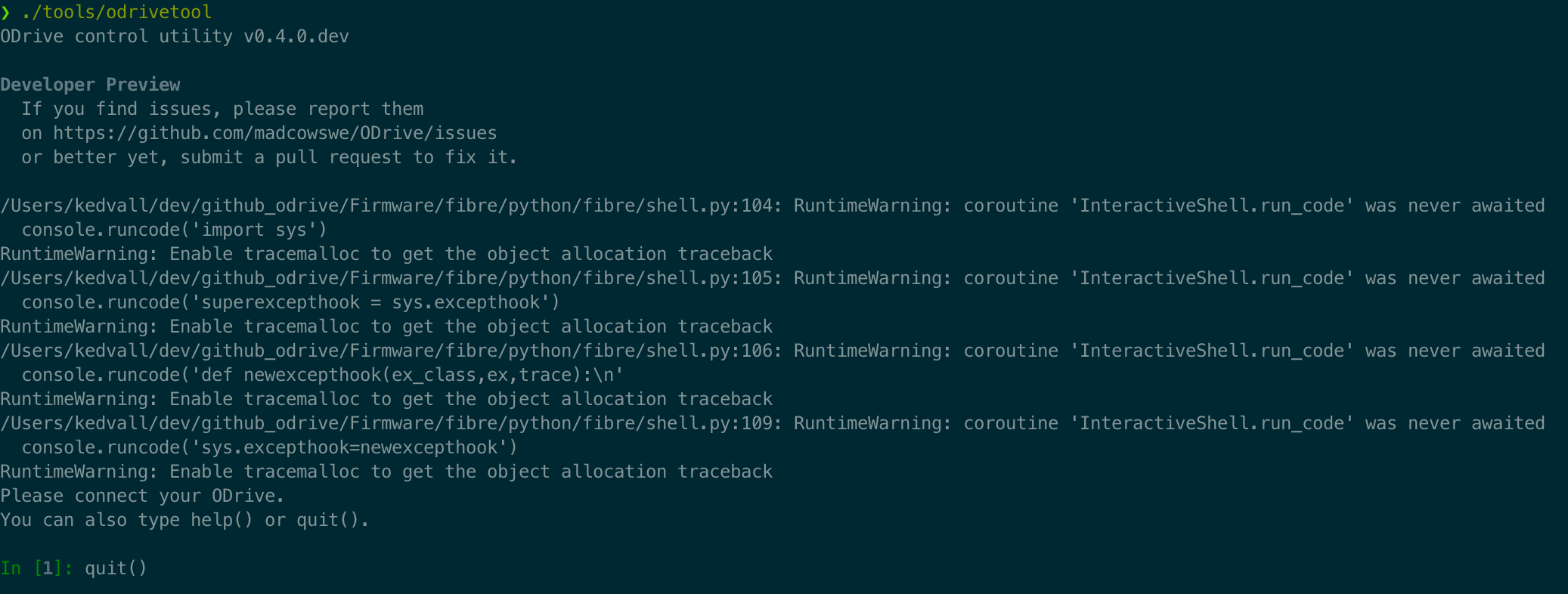 This PR should fix the RuntimeWarning: coroutine ... was never awaited errors when running the dev version of odrivetool.