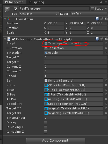 - This is the game object mentioned above in the inspector, you can see the script attached. The actual name of the script is circled.