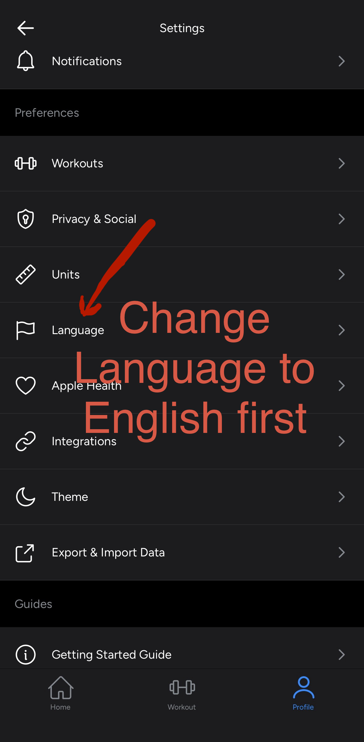 - Switch your Hevy app language to English