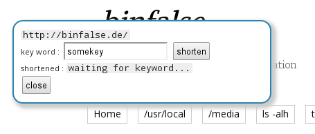Click the icon to shorten the URL of the web site you're currently visiting and a popup will appear. If you've configured the extension to ask for a keyword the popup will contain a textfield and a button. Just type the keyword into the field and press the button to start shortening. In case you didn't set the Ask for a keyword tick, the extension will shorten the URL immediately.