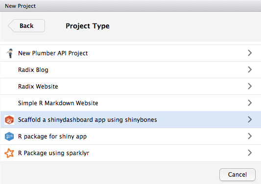shinybones::sb_add_snippets()You can easily scaffold a shinydashboard app using shinybones by clicking on the New Project menu in RStudio