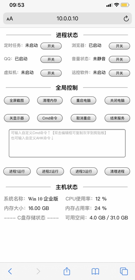 运行 HTTPRemoteConsole.exe后正常会转到网页控制台的界面,同时会将你的局域网地址和端口同步到剪贴板中,方便发送到手机端和在手机端使用。也可以通过公网IP或者内网穿透,方便的在外控制电脑。