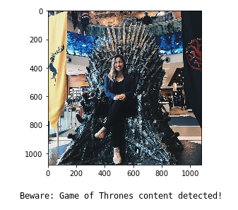Interestingly, I tested an image that I took myself of my girlfriend sitting on the Iron Throne that was on display at the AT&T store in San Francisco and the model wasable to recognize that the image did in fact contain GoT related content. Pretty Cool!