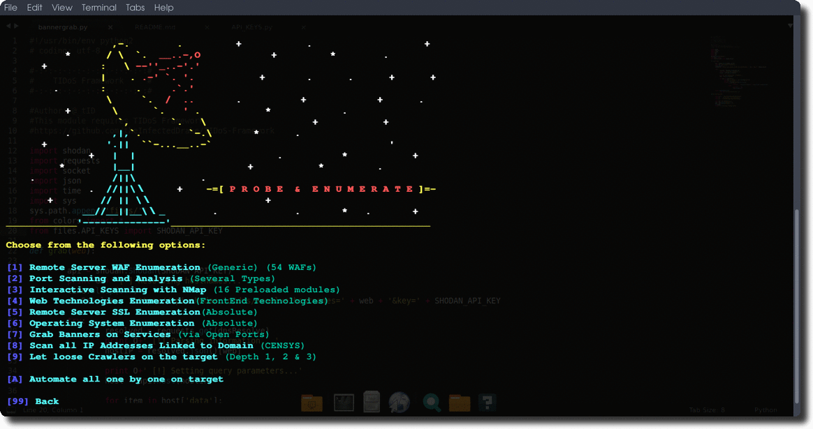 But before that, you need to set your own API KEYS for various OSINT purposes. To do so, open up API_KEYS.py under files/ directory and set your own keys and access tokens for SHODAN, CENSYS, FULL CONTACT, GOOGLE and WHATCMS. Public API KEYS and ACCESS TOKENS for SHODAN and WHATCMS have been provided with the TIDoS release itself. You can still add your own... no harm!