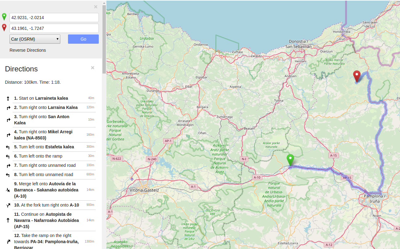 Distantzia eta iraupena lortzeko OSRM web-zerbitzua erabili da. API honek eskaintzen dituen aukeretatik "route service" zerbitzua erabili da. Honi GET eskaera bidez bi kokaleku pasako dizkiogu, eta JSON objektu bat sortuko digu, bi kokaleku hauen arteko bide laburrenaren iraupen eta distantziak barne izango dituena. Zerbitzuari GET eskaera egiteko requests liburutegia erabili da. Ausaz sortutako kokalekuen formatua aldatu beharko da, zerbitzuak eskatzen duenera egokitu dadin. Behin URLa sortuta, zerbitzariari GET eskaera egingo zaio. Zerbitzariak erantzuten duenean erantzun zuzena izango direnn distantzia eta iraupena izango ditugu.