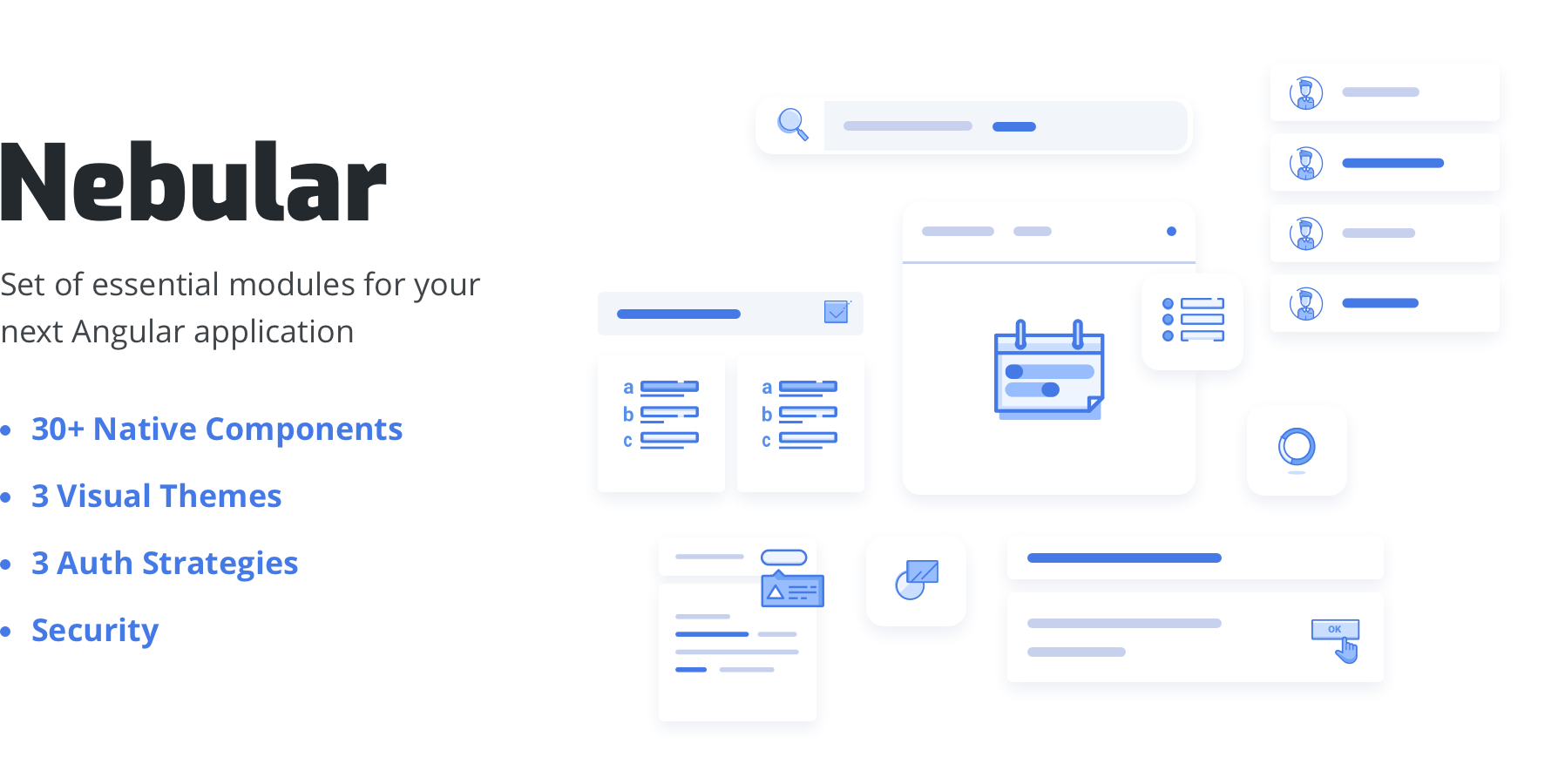 Nebular is a great toolkit if you build Rich UI web-application based on Angular, and want to bootstrap your development using essential features out of the box. It provides you with a set of native Angular components, themeable components, authentication and security layers easily configurable for your API. At the same time, Nebular allows you to use it together with any other UI library you choose.