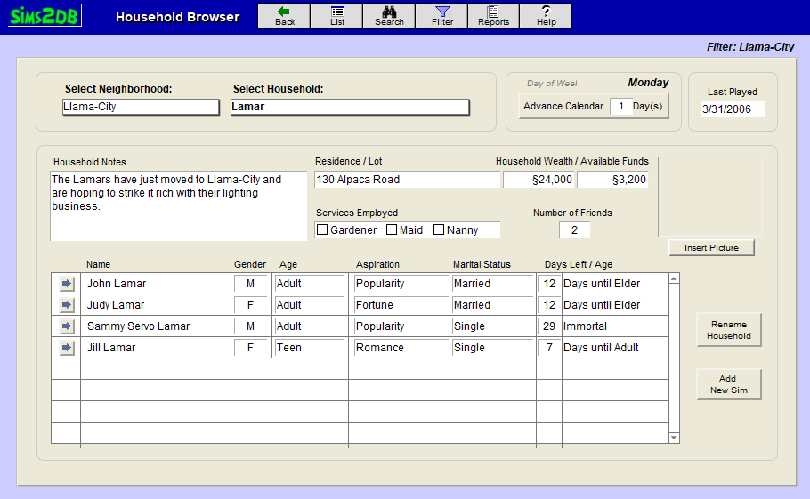 - Tracks your Sims individually or by household.