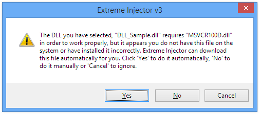 If Extreme Injector detects that a hack you are adding requires MSVCR.dll, MSVCP.dll or d3dx9_.dll and you do not have it installed, it will offer to automatically download the correct version (x86 or x64) from the Microsoft website and install it for you.