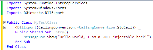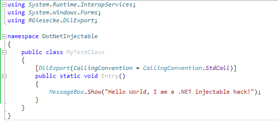 Note that I had to add a reference to System.Windows.Forms to use the MessageBox class. Also note that I specified the StdCall convention. This is very important. I recommend you use either Cdecl or StdCall, it doesn’t matter which one because Extreme Injector supports both.