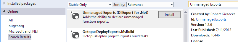 This is all possible with the help of a library called Unmanaged Exports by Robert Giesecke. Simply add the NuGet package to your Class Library project. To add the NuGet package, either use the command shown on the link provided or search for Unmanaged Exports under Project > Manage NuGet Packages > Online > Search. Please note if you are using Visual Studio 2010 or older you need to install NuGet first because it’s not built in.