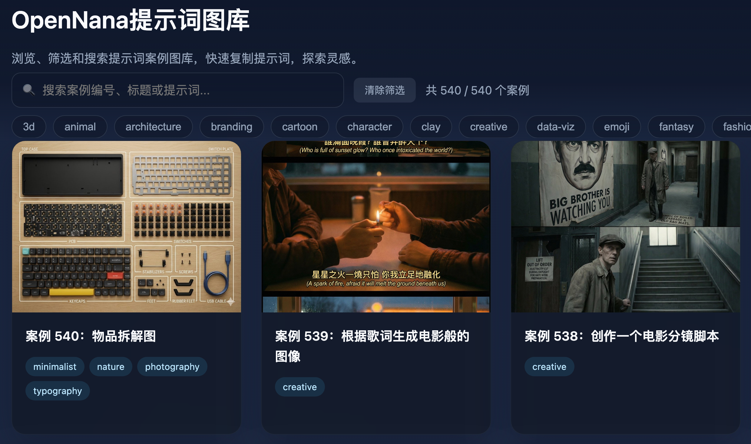 地址:https://opennana.com/awesome-prompt-gallery/ 540 个案例直接使用
