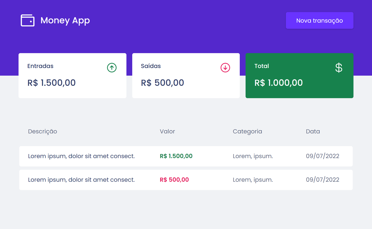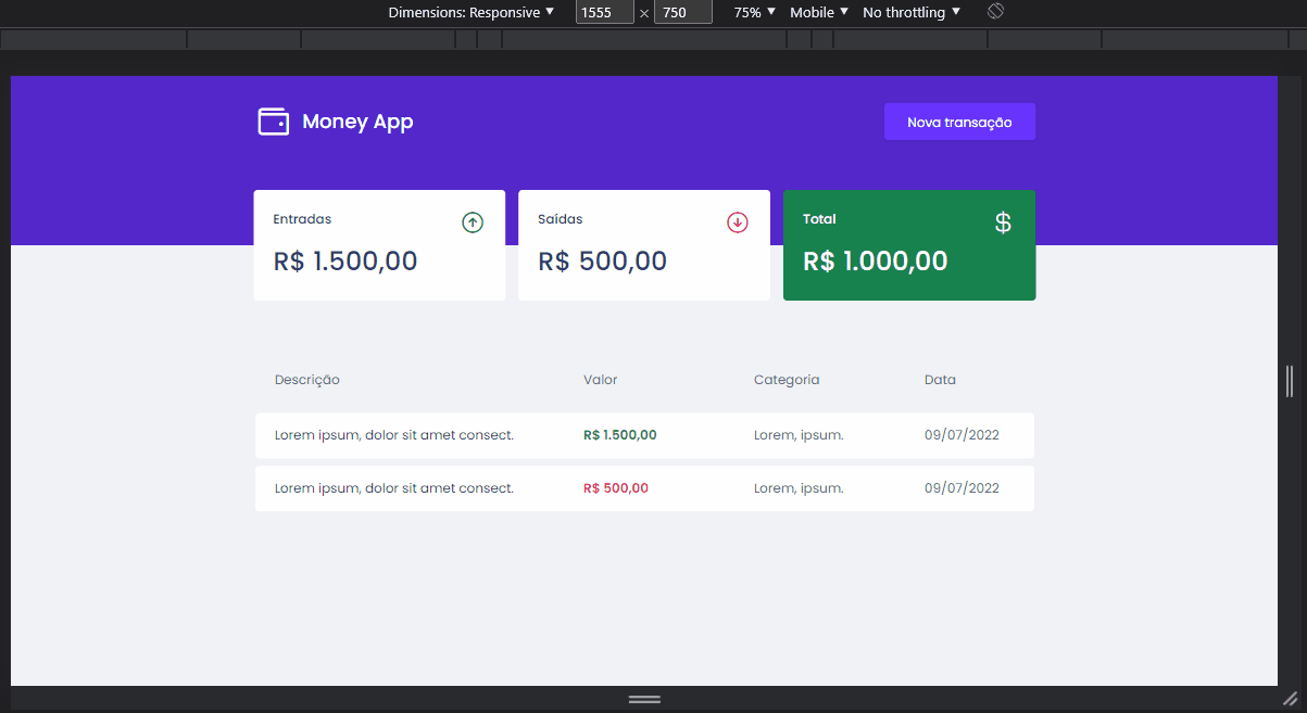 Este é um projeto que está sendo criado com base em um outro já existente chamado dt money, desenvolvido no curso Ignite da Rocketseat. E para levar este projeto ao próximo nível estou dando uma atenção em especial para acessibilidade, responsividade e simplicidade.
