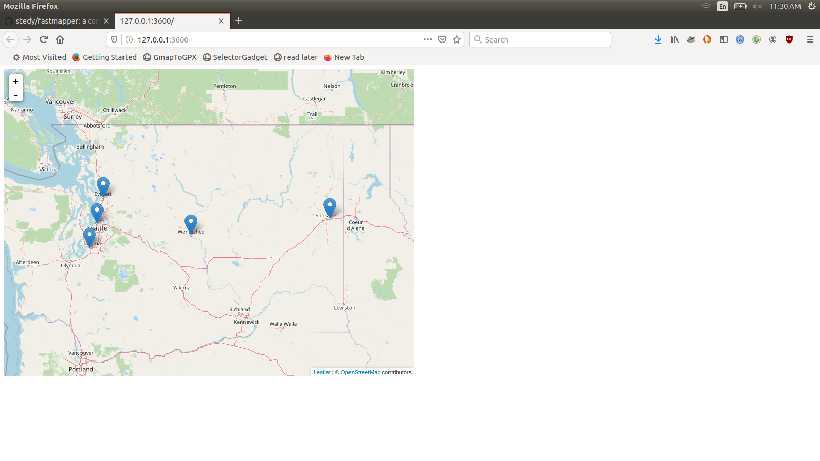 The main script geolocates all the addresses, writes them to a GeoJSON file which is then mapped to a Leaflet map in a new browser window.