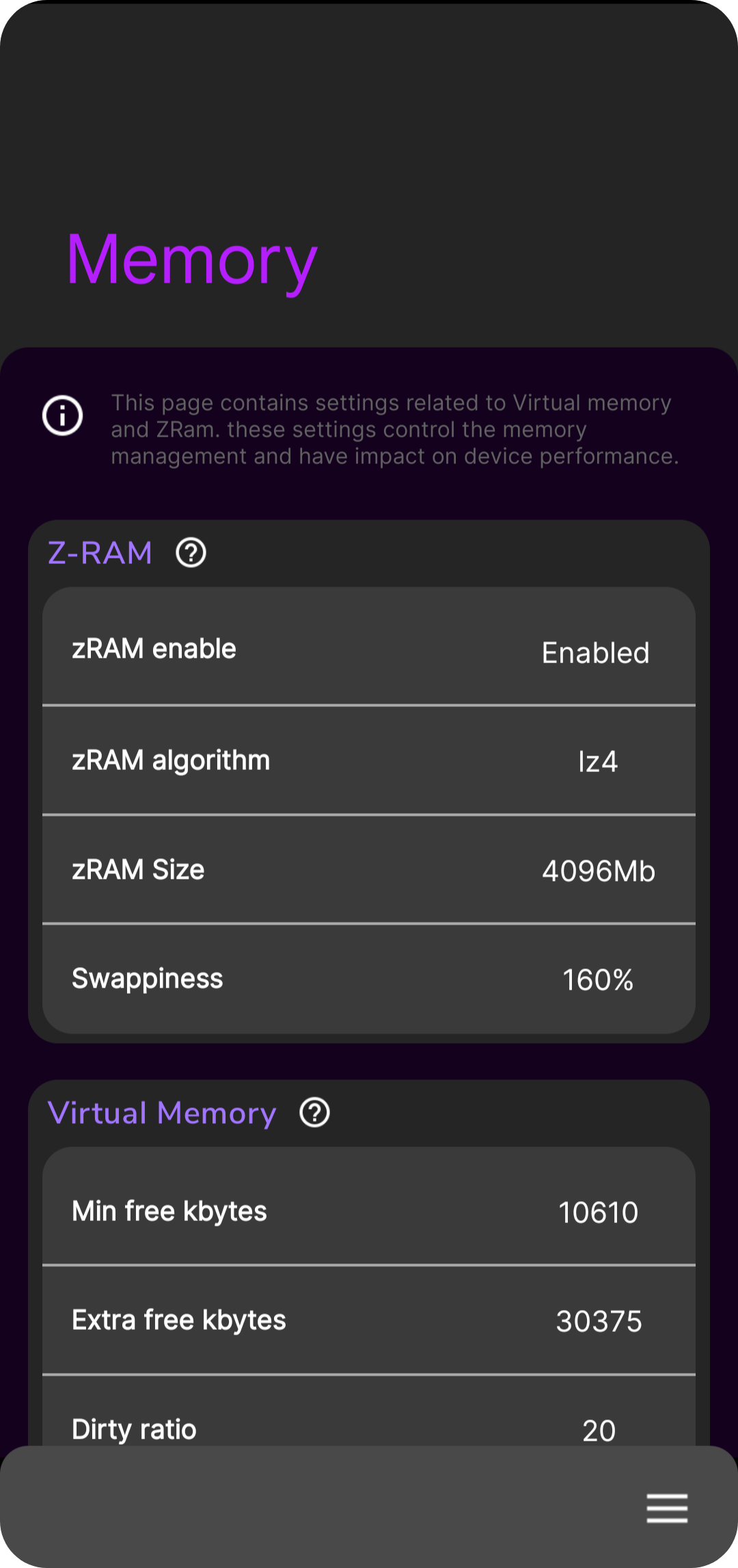 - Memory settings