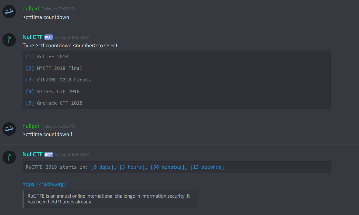!ctftime countdown/timeleftCountdown will return when a selected CTF starts, and timeleft will return when any currently running CTFs end in the form of days hours minutes and seconds.