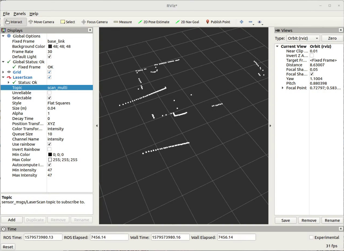 After lanes are detected, the lanes are converted to a sensor_msgs/LaserScan using lane_laser_scan.py and merged using ira_laser_tools. The output is a merged scan that includes both lanes and other obstacles in one LaserScan message as show in the image below.
