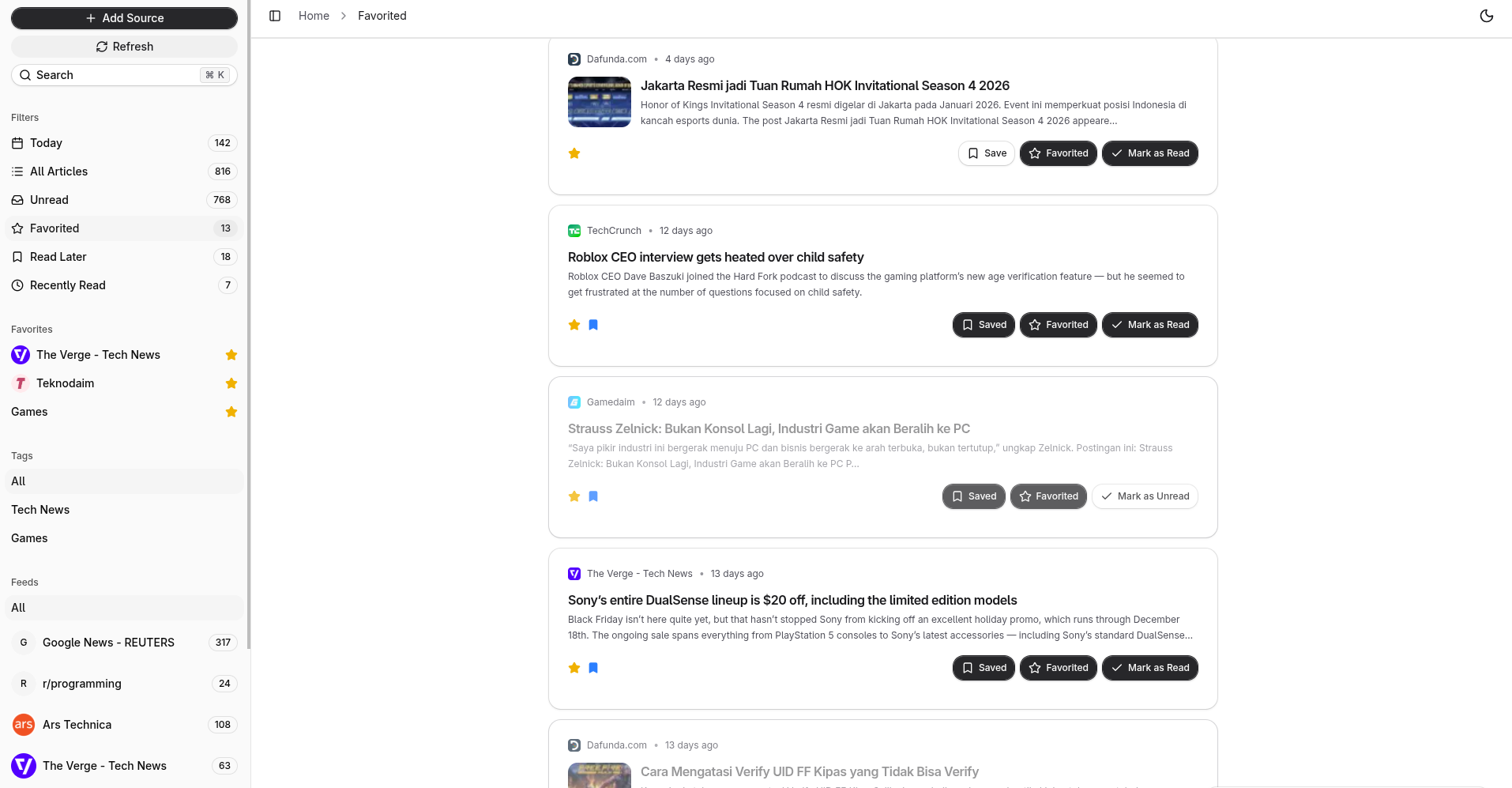 An open-source, self-hosted alternative to Feedly. A modern RSS feed reader that brings all your favorite content into one beautiful, distraction-free interface. Subscribe to RSS feeds, follow Reddit communities, track Google News topics, and organize your reading experience with powerful tagging and tracking features.